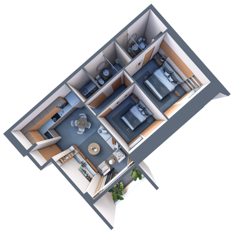 Smart design for a modern and practical life. This model optimizes every square meter to offer you all the luxury of Selea in a cozy and efficient format. It features two bedrooms, the master with a private bathroom, and a social area with an integrated kitchen that opens to the balcony. It is the ideal choice for couples, professionals, or as a high-yield investment due to its great functionality. It includes a closed laundry area and a covered parking space.